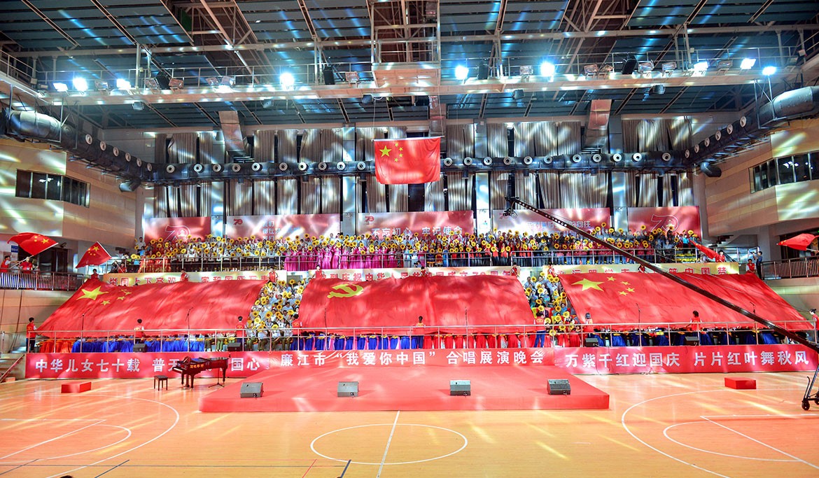 會(huì)場選在廉江體育館舉辦,廉江電視臺(tái)現(xiàn)場直播與市民一起同慶共樂,我司將會(huì)場設(shè)計(jì)了一系列建國70周年和新中國發(fā)展壯大的展板和標(biāo)語來營造國慶氣氛,參與表演的演員人手一朵太陽花象征新中國發(fā)展正值朝陽之時(shí),還做了兩面10x5米紅旗和一面11x5米的黨旗,為“立國篇”開場展示黨和國家的強(qiáng)大。